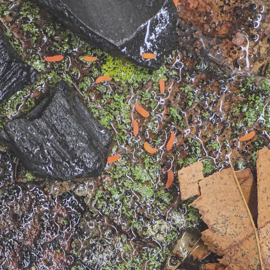 Yuukianura aphoruroides, commonly known as Orange Springtails, are a vibrant, surface-active springtail prized for their bold orange coloration and unique behavior. Unlike many white springtails that remain hidden in the substrate, Orange Springtails are often visible as they forage—making them an excellent choice for display bioactive enclosures.